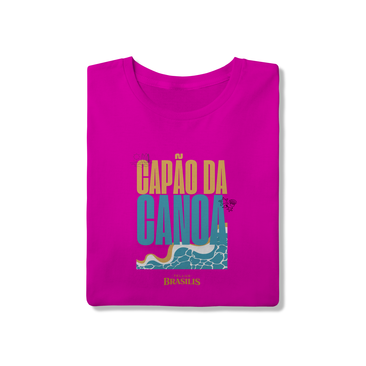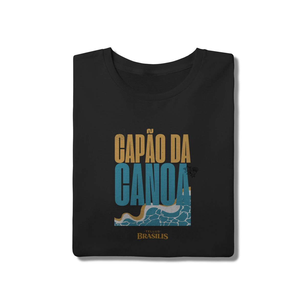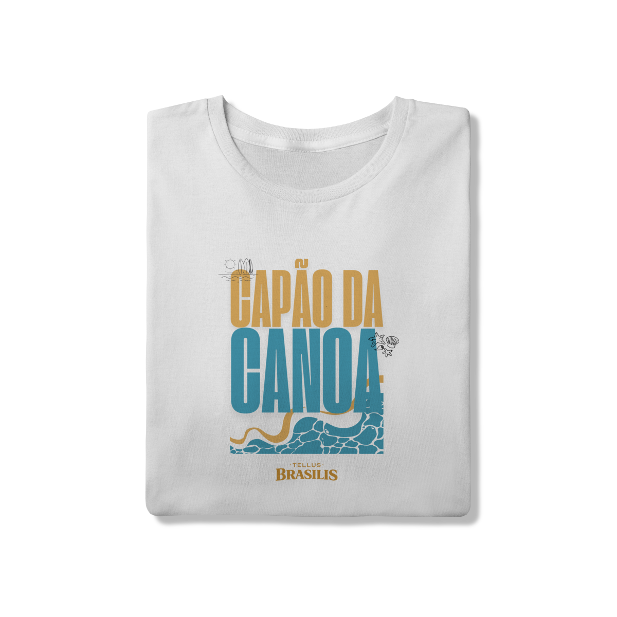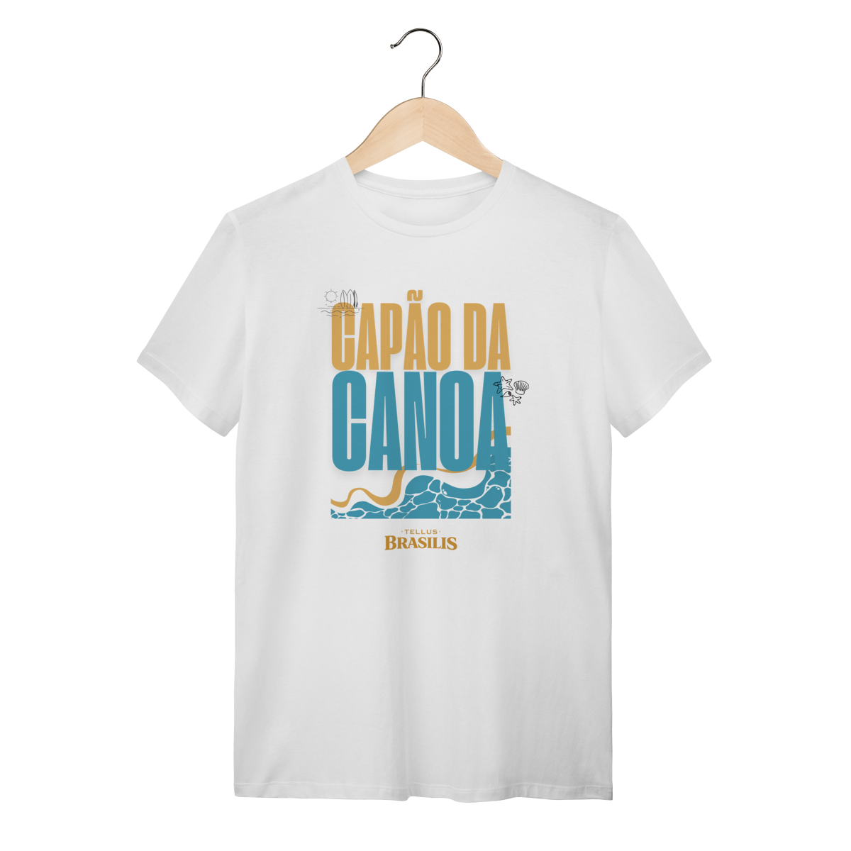 Esta camisa celebra Capão da Canoa, uma das praias mais emblemáticas do litoral gaúcho, traduzindo em poucos elementos visuais tudo o que o lugar representa. A tipografia forte, as cores do sol e do mar e o desenho das ondas remetem imediatamente ao encontro simples e essencial entre areia, água e céu — símbolos do verão, do descanso e das memórias vividas à beira-mar.