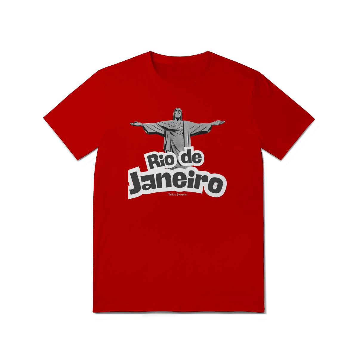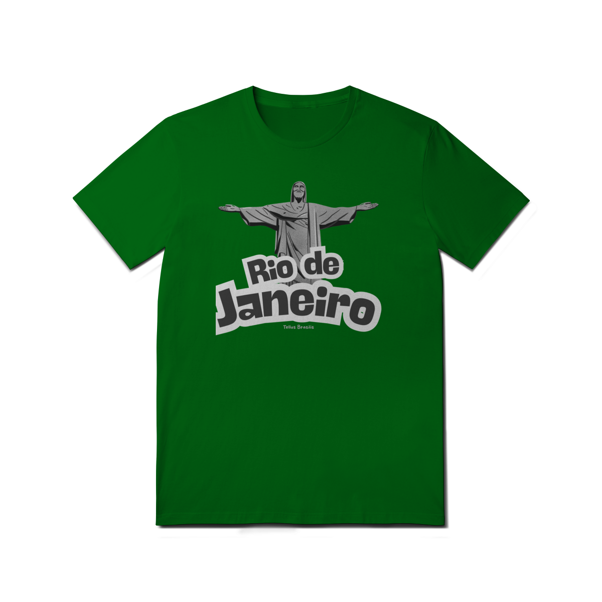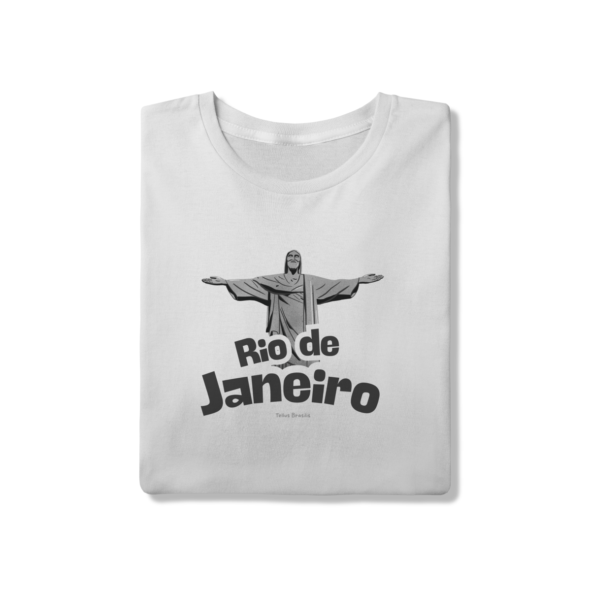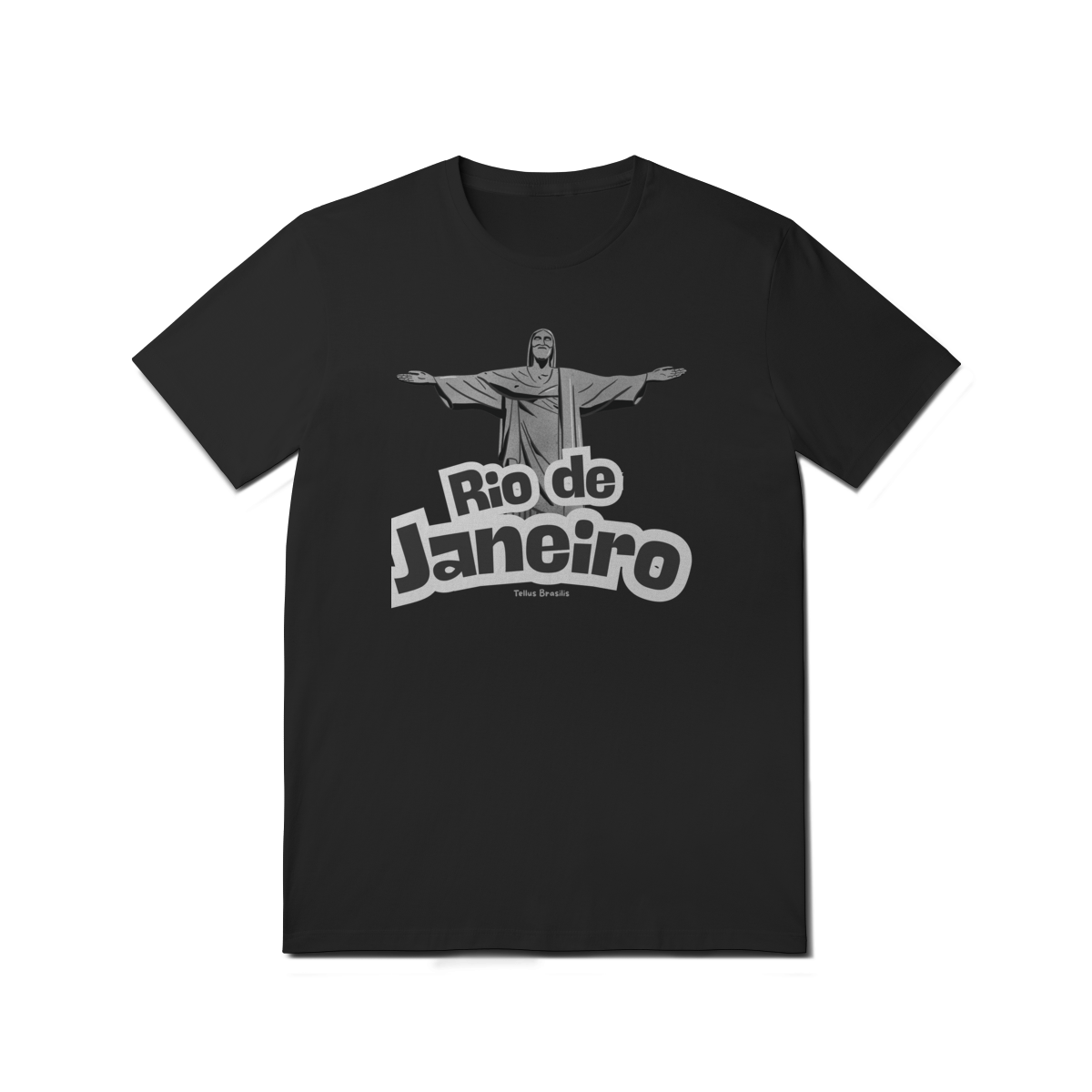 O nome Rio de Janeiro aparece em tipografia robusta e dinâmica, reforçando o caráter urbano e icônico da estampa. A composição transmite orgulho, pertencimento e admiração por uma das cidades mais reconhecidas do mundo, conectando espiritualidade, paisagem e cultura.