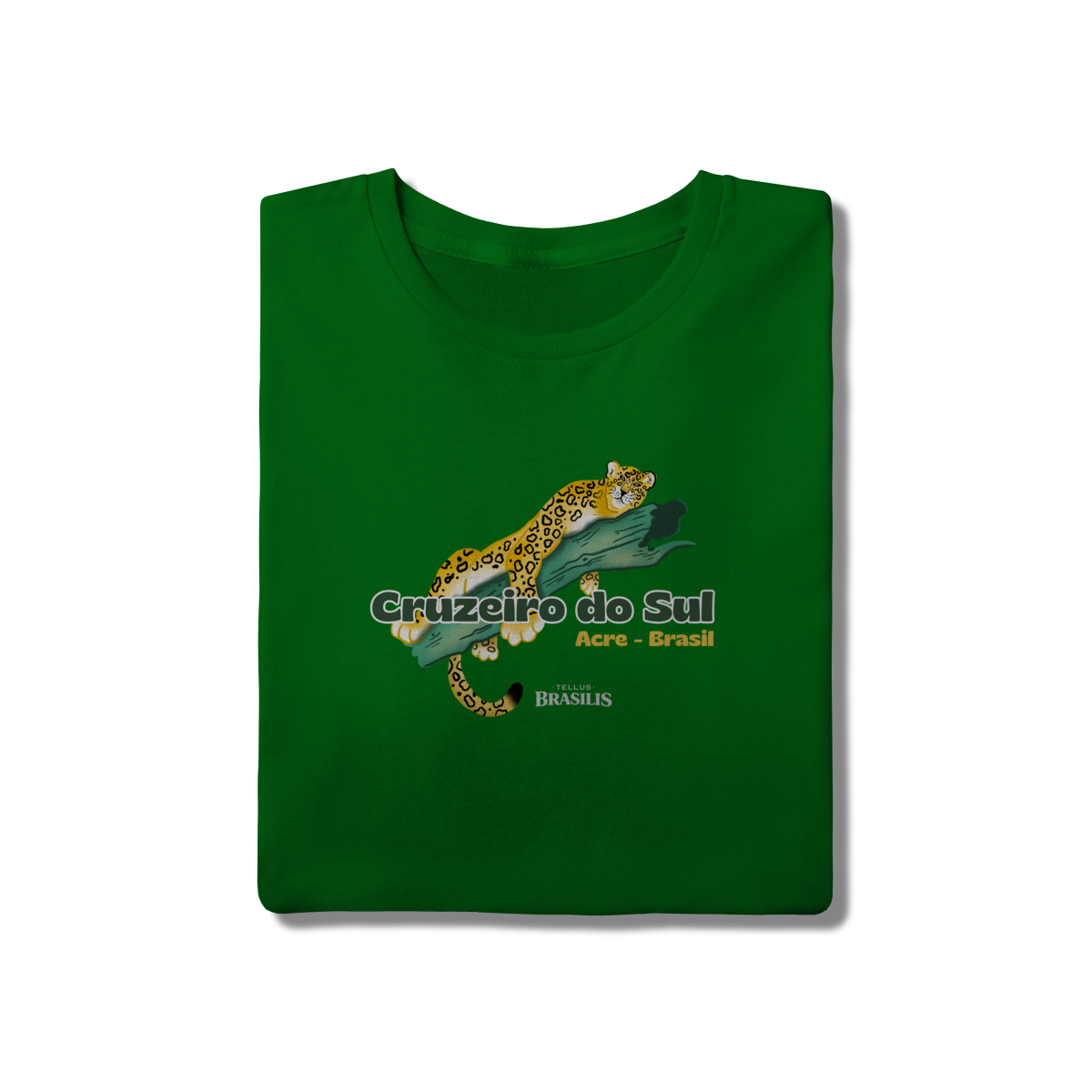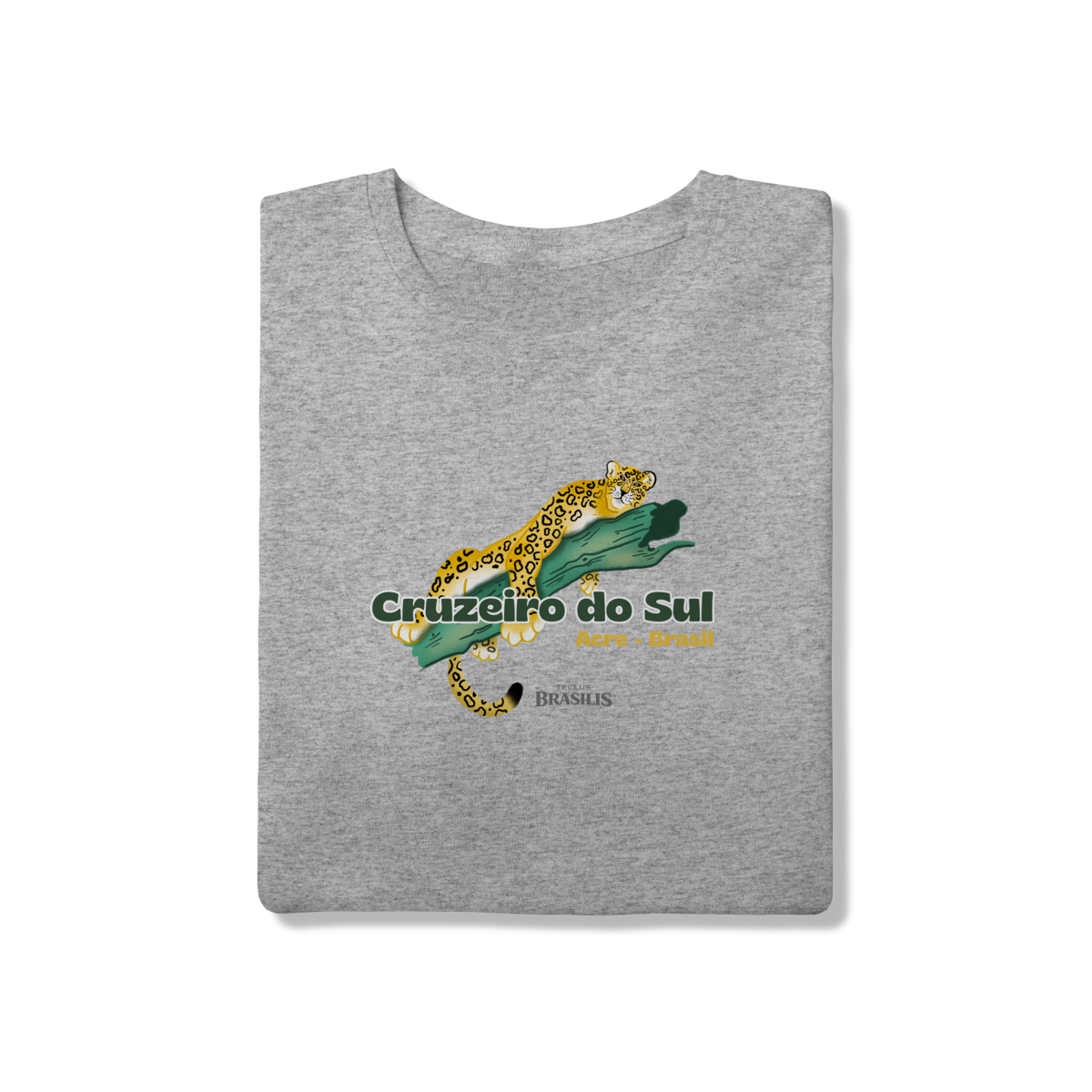 A estampa celebra a força e a identidade amazônica de Cruzeiro do Sul, trazendo a onça — símbolo da fauna da floresta — repousando sobre um tronco, em uma cena que transmite tranquilidade, resistência e conexão com a natureza. A ilustração remete à riqueza ambiental da região do Vale do Juruá, onde a vida silvestre, os rios e a floresta fazem parte do cotidiano e da identidade cultural da cidade.