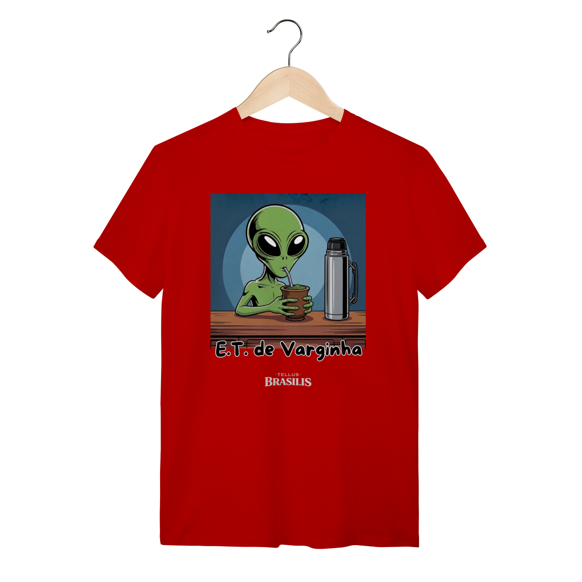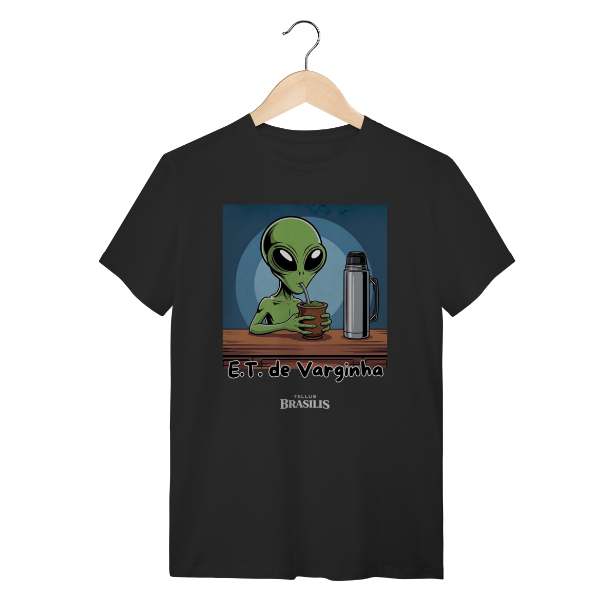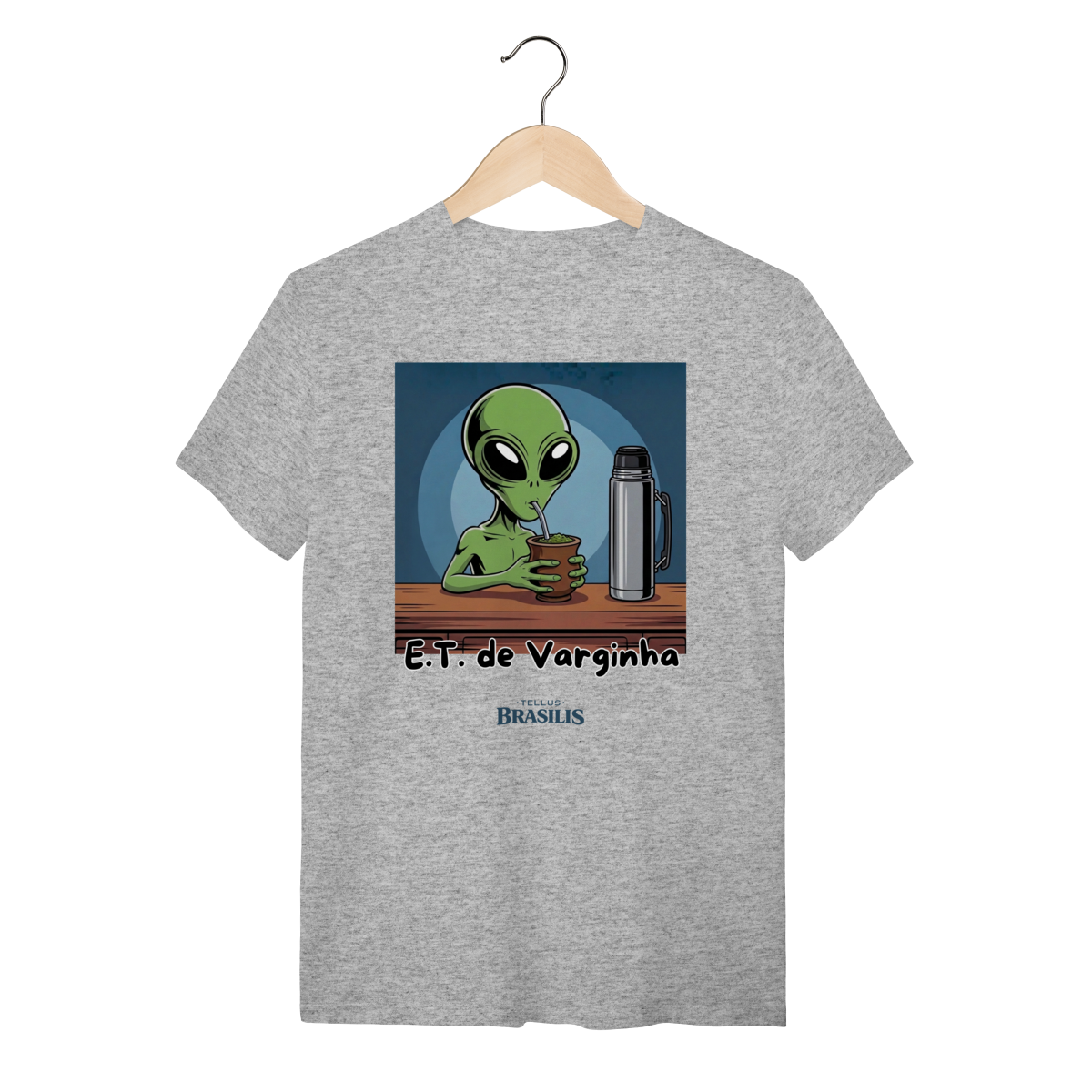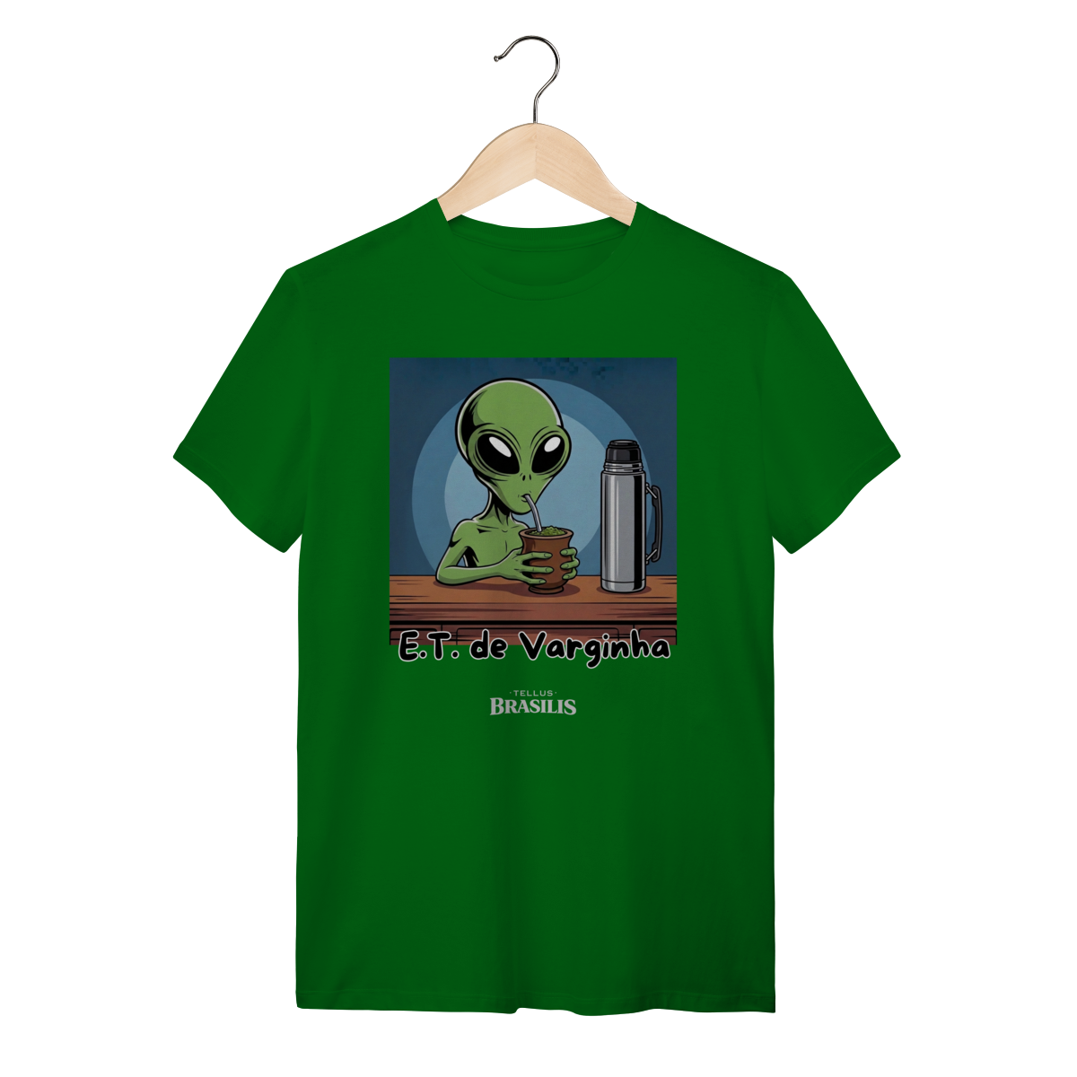 Direto do maior mistério brasileiro, nasce uma estampa que mistura folclore, humor e cultura popular: o E.T. de Varginha, agora em versão bem-humorada, devidamente adaptado aos costumes da Terra — e, claro, com um bom chimarrão na mão.