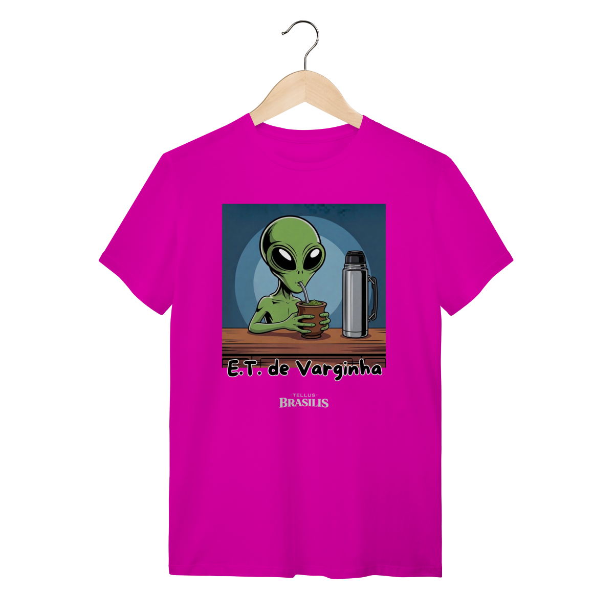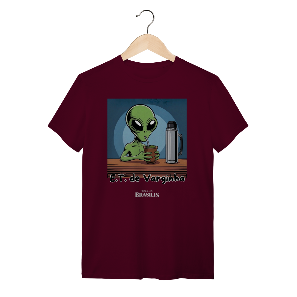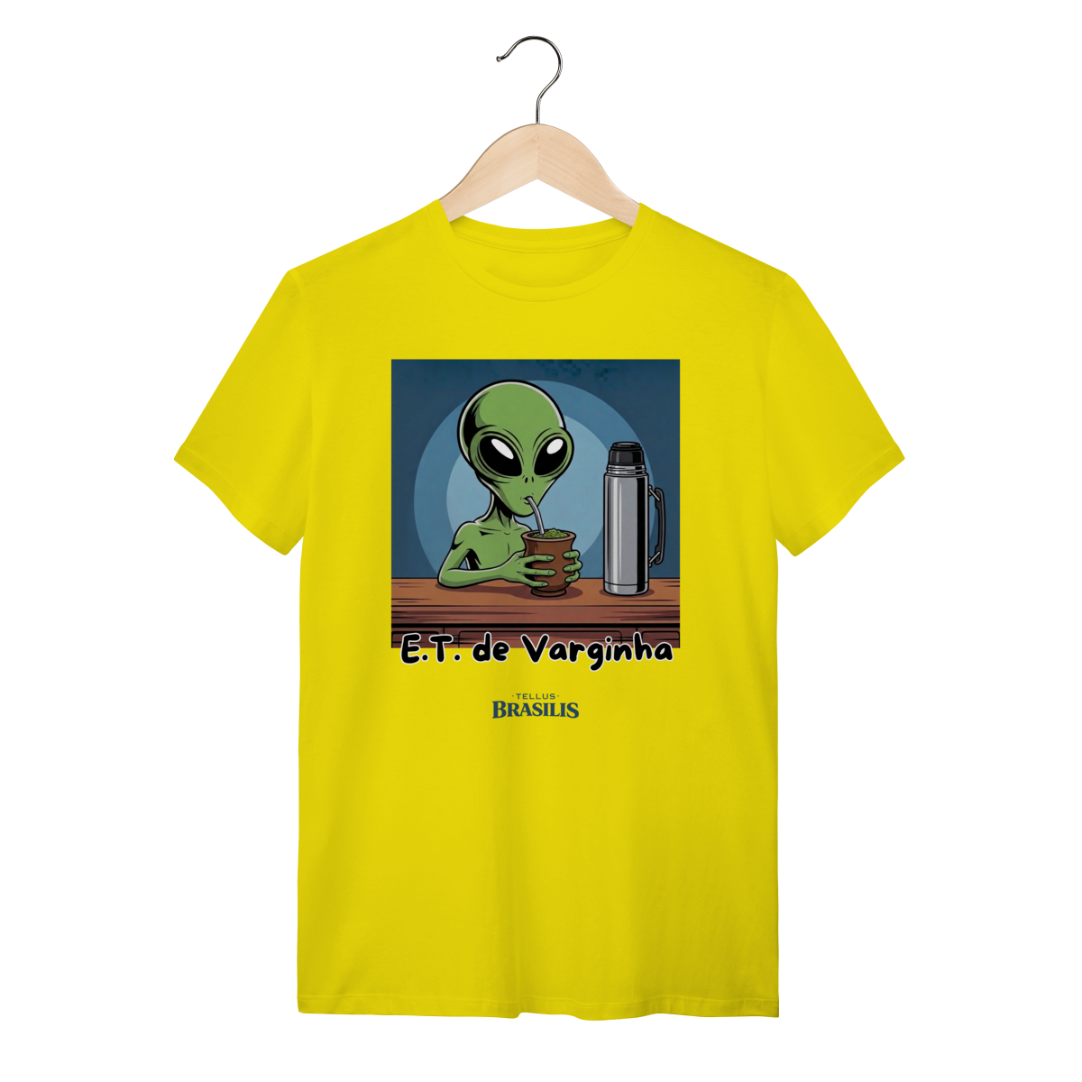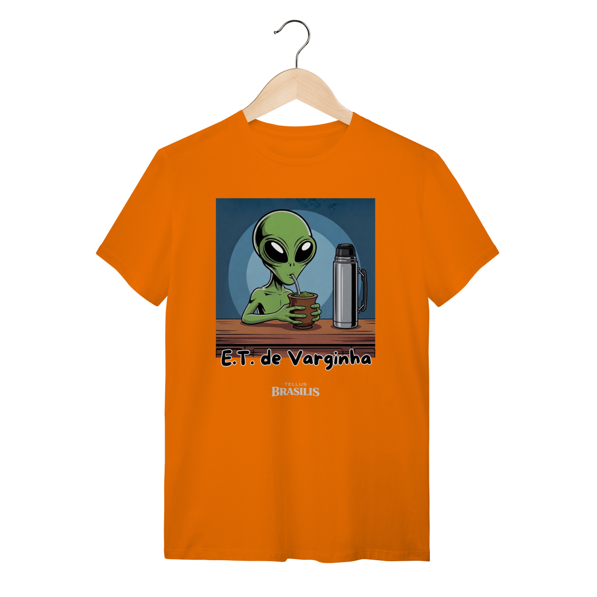 Direto do maior mistério brasileiro, nasce uma estampa que mistura folclore, humor e cultura popular: o E.T. de Varginha, agora em versão bem-humorada, devidamente adaptado aos costumes da Terra — e, claro, com um bom chimarrão na mão.