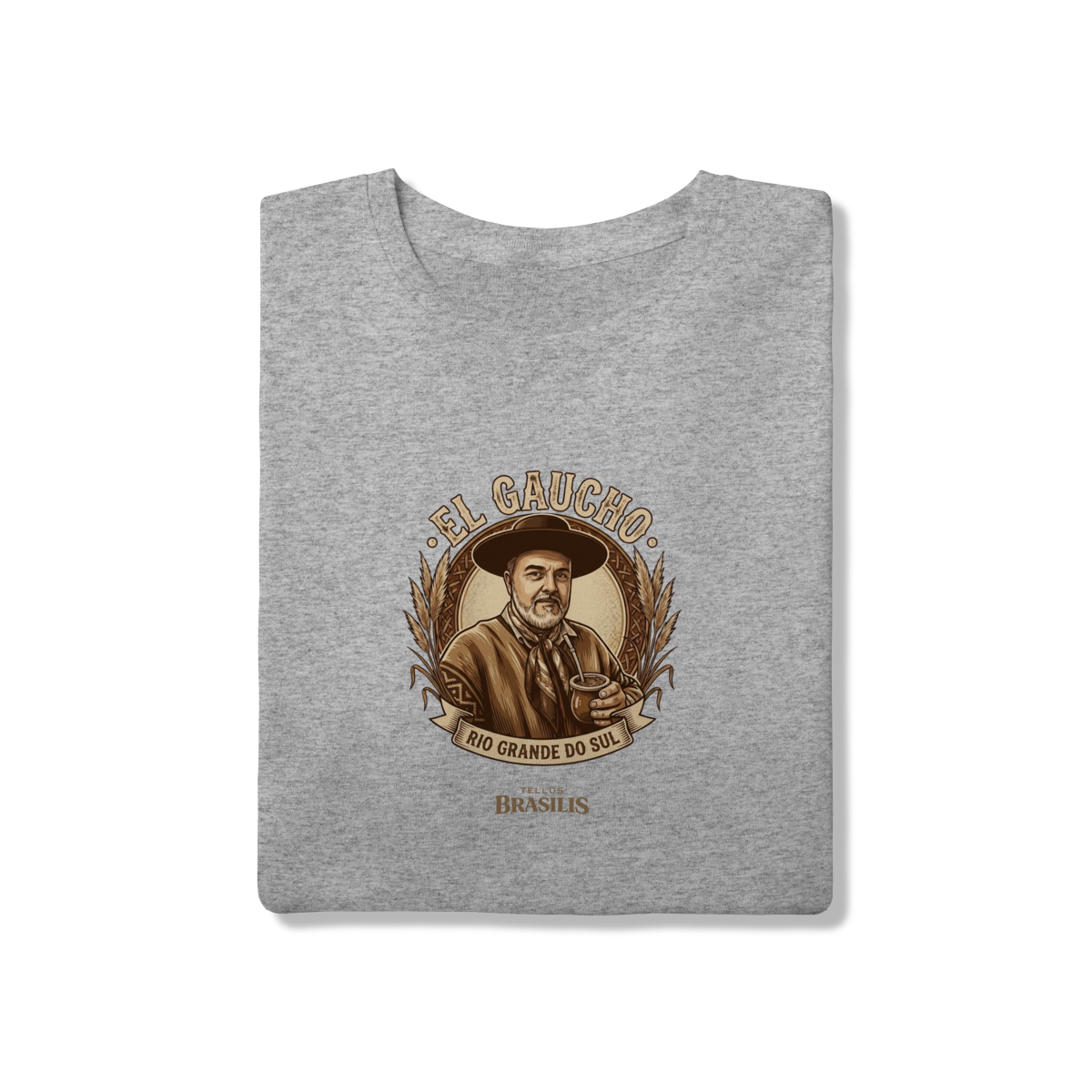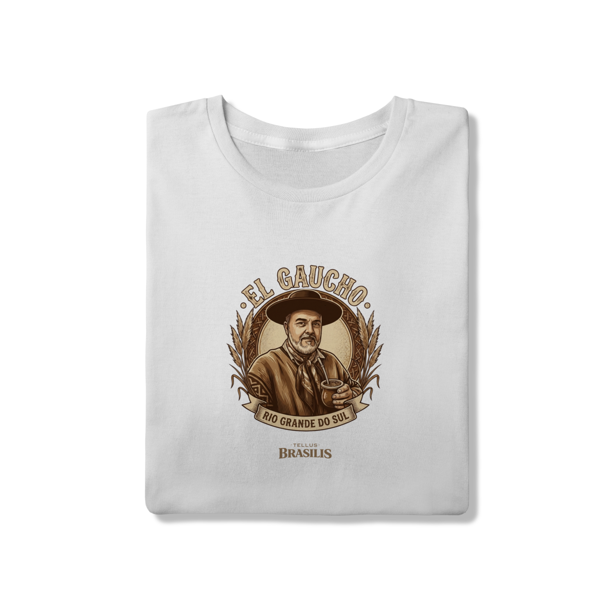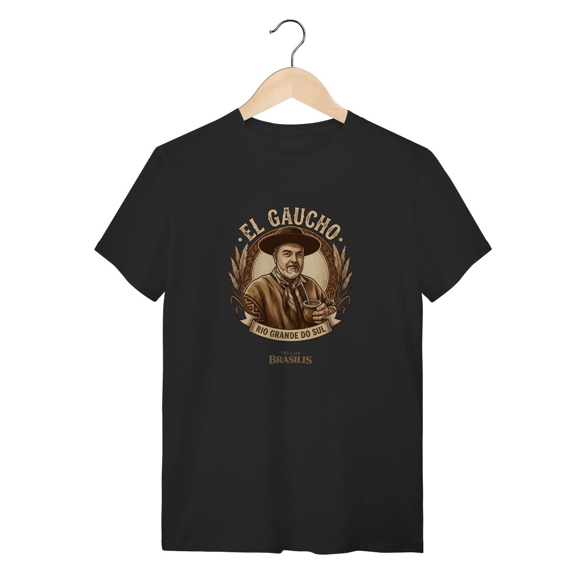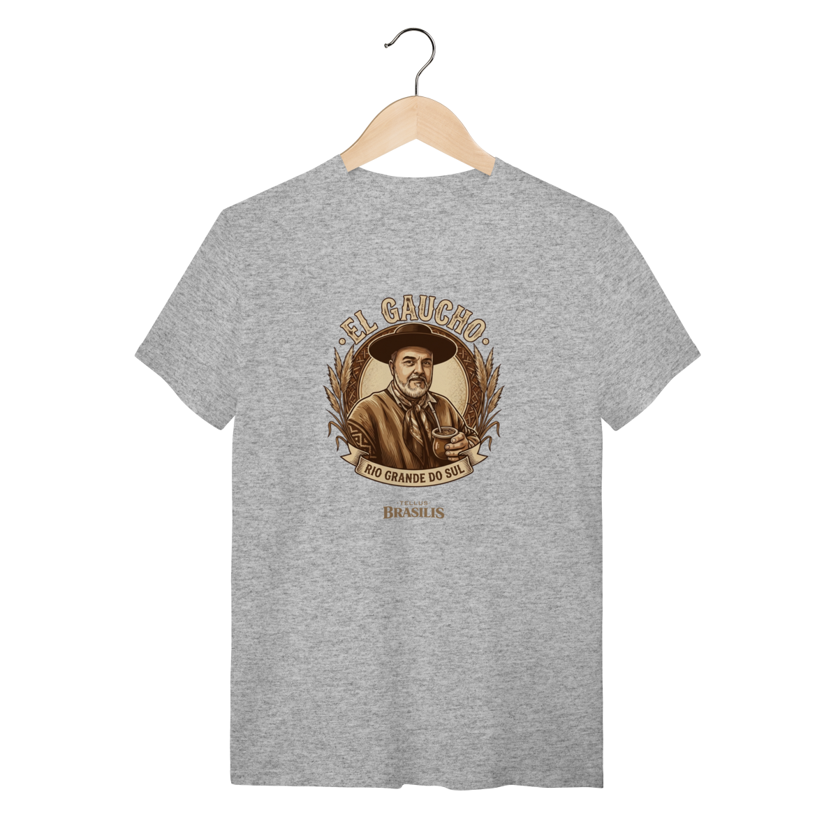 Os detalhes do brasão, das espigas e da moldura reforçam a ligação com a terra fértil e com os valores do povo gaúcho: respeito, trabalho, amizade e tradição. É uma estampa que carrega identidade, memória e pertencimento, ideal para quem vive o Rio Grande do Sul no coração.