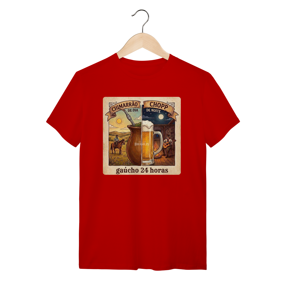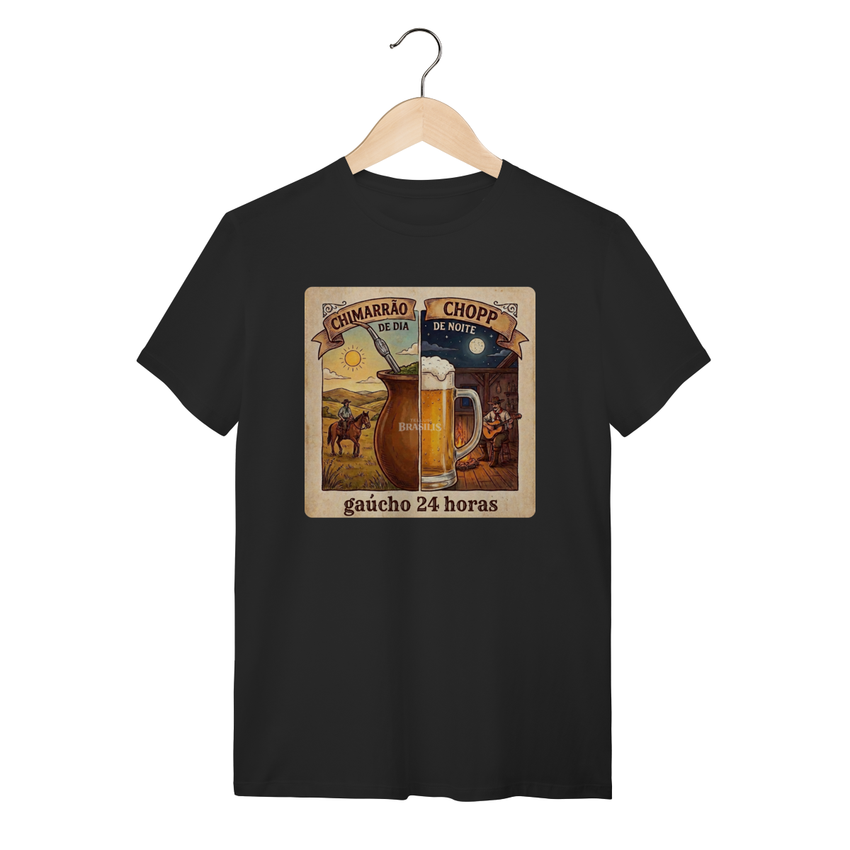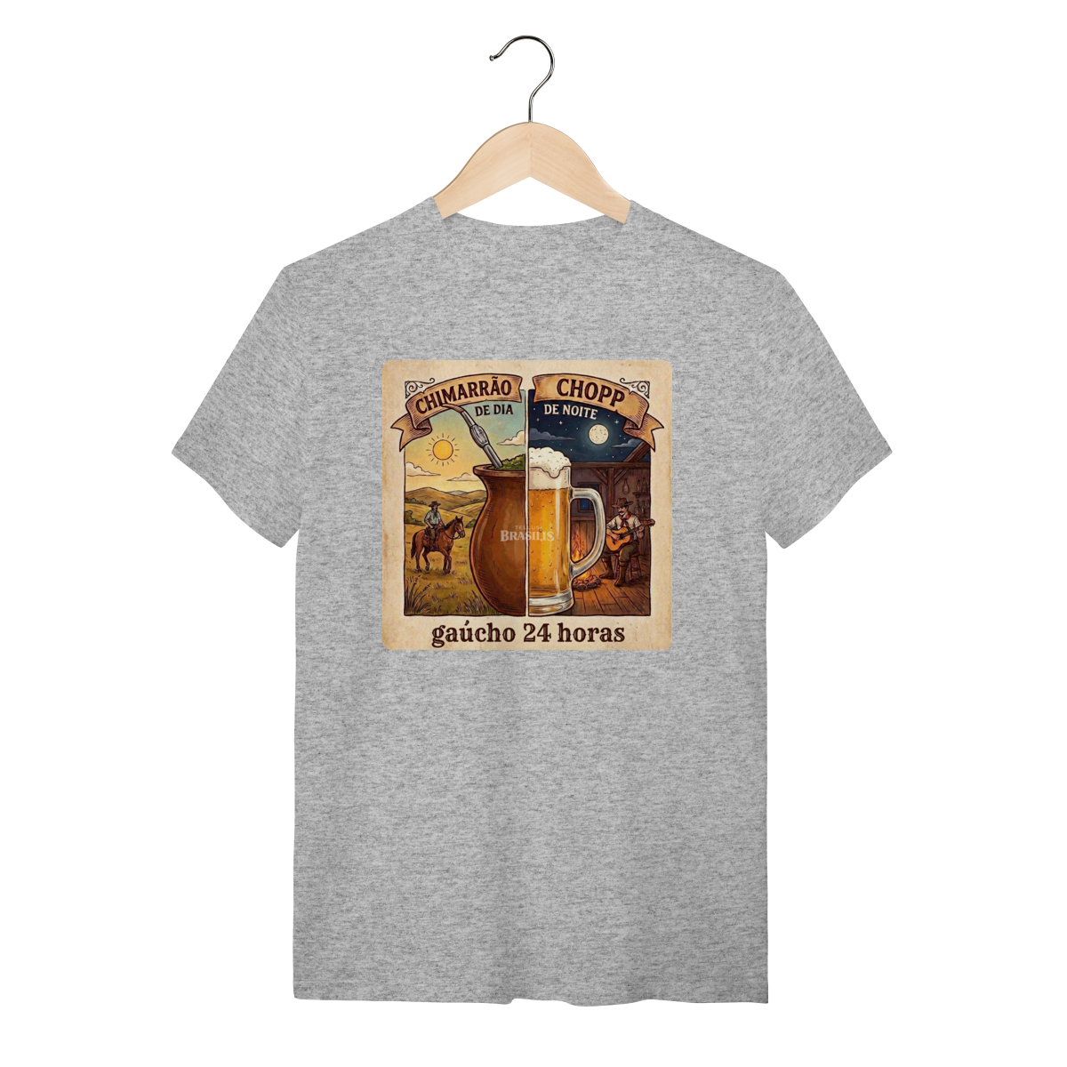 A estampa “Gaúcho 24 horas” traduz com muito humor e identidade o jeito único de ser do Rio Grande do Sul. De um lado, o dia começa com o clássico chimarrão, símbolo de tradição, parceria e costume passado de geração em geração. Do outro, a noite é celebrada com um chopp bem gelado, representando descontração, alegria e bons momentos ao redor do fogo, da música e da conversa.
