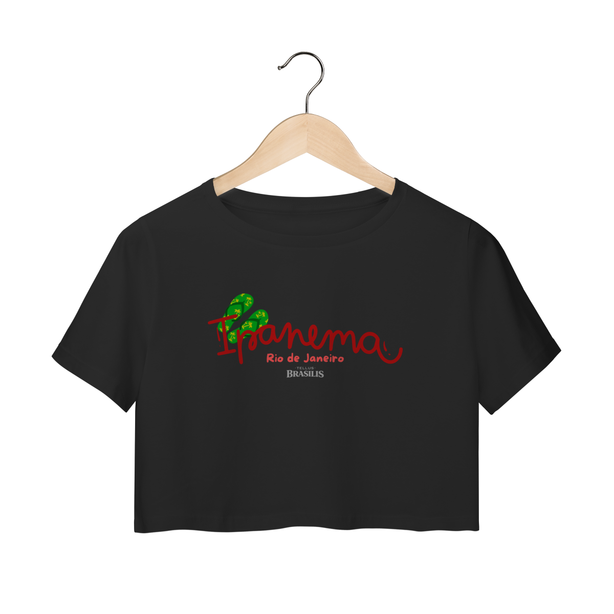 O modelo cropped traz a transcrição Ipanema em lettering descontraído, acompanhada do detalhe das sandálias, símbolo do estilo de vida leve, praiano e autêntico do Rio de Janeiro. A estampa remete ao clima ensolarado, à liberdade e à energia única de um dos bairros mais icônicos do Brasil, traduzindo a essência carioca de viver com simplicidade, cor e alegria.