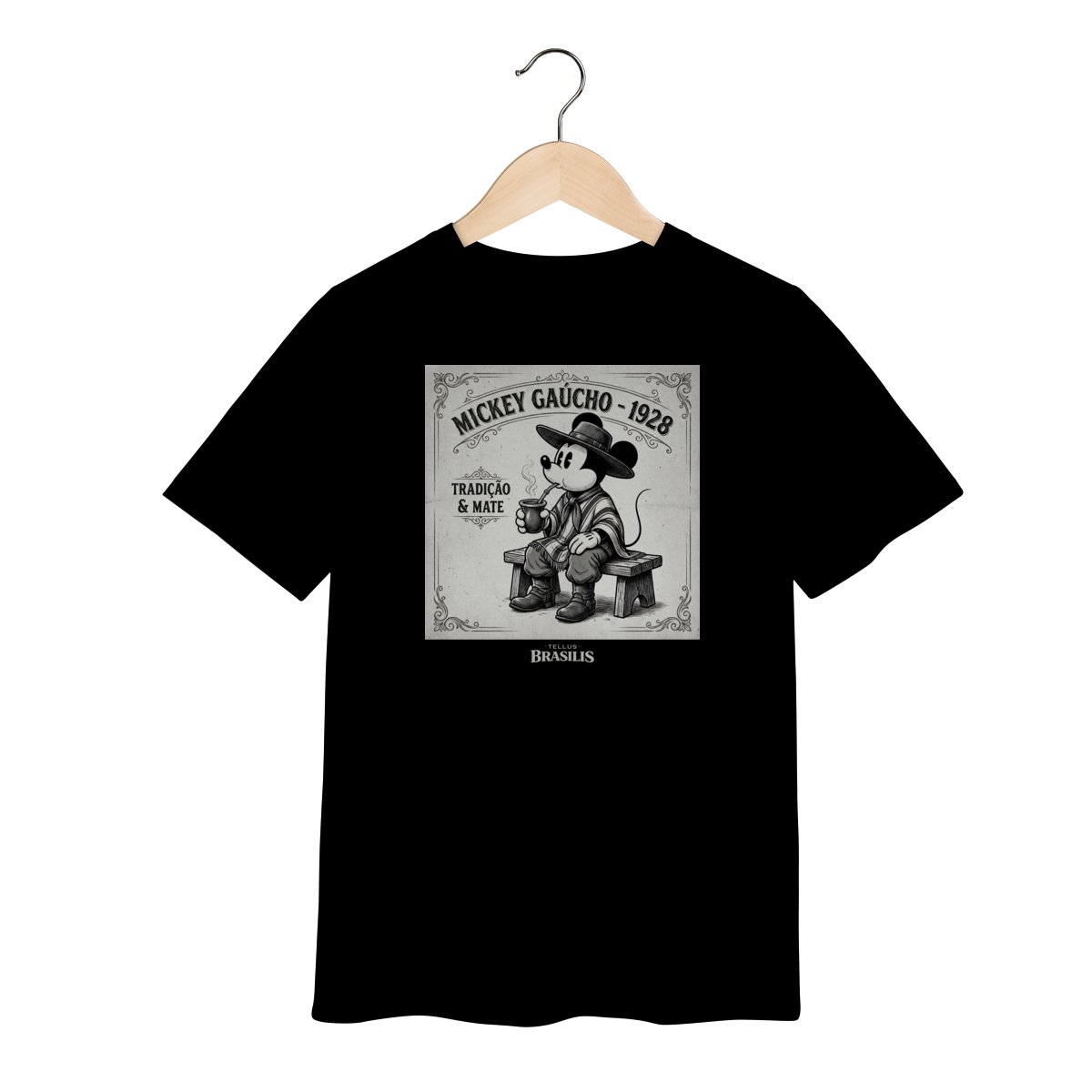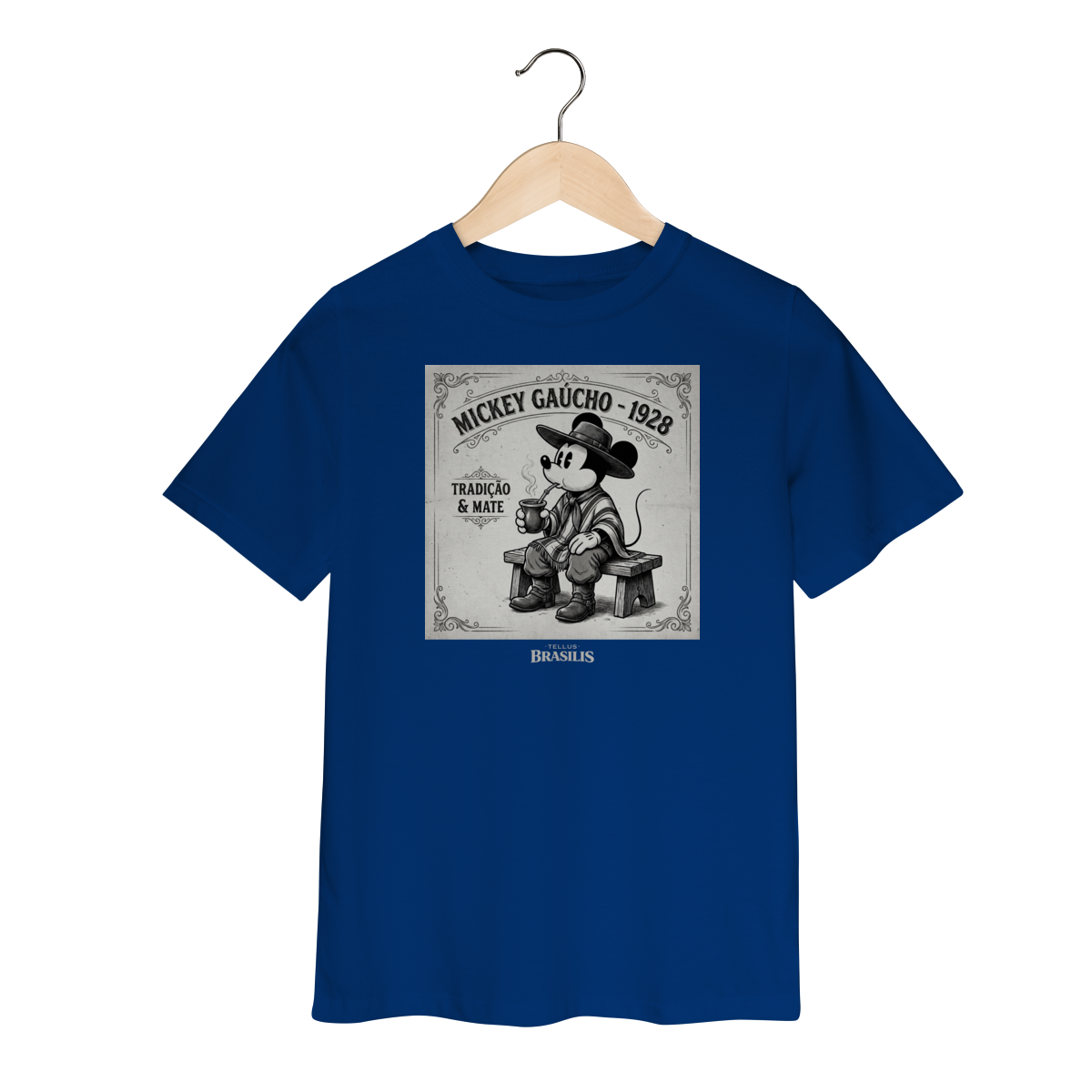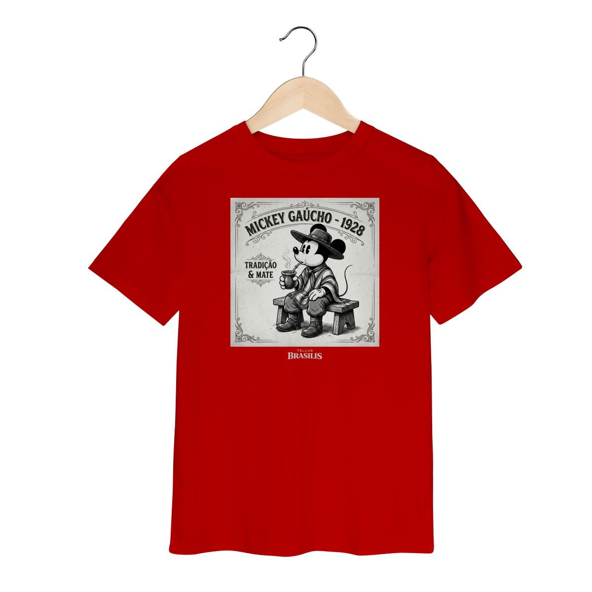 Esta camiseta infantil traz uma estampa divertida e cheia de carinho cultural: o clássico ratinho em versão gaúcho, vestindo bombacha, chapéu e poncho, saboreando um chimarrão com aquele jeitinho tranquilo do sul. A arte tem um estilo retrô e lúdico, inspirada no charme das ilustrações antigas, mas adaptada para o universo infantil, com traços suaves e expressão amigável.