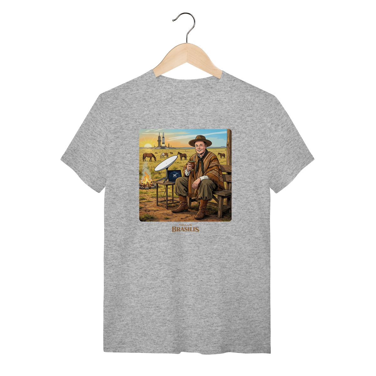 Uma cena improvável e hilária: inspirada no universo de Elon Musk, a estampa mistura o futuro com a tradição gaúcha. Enquanto a tecnologia espacial desponta ao fundo, o personagem — de bombacha, chapéu e sorriso confiante — faz uma pausa estratégica para matear, segurando o chimarrão como quem diz: “antes de ir a Marte, um gole de erva-mate”.