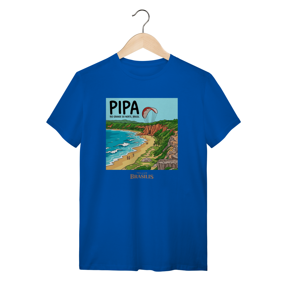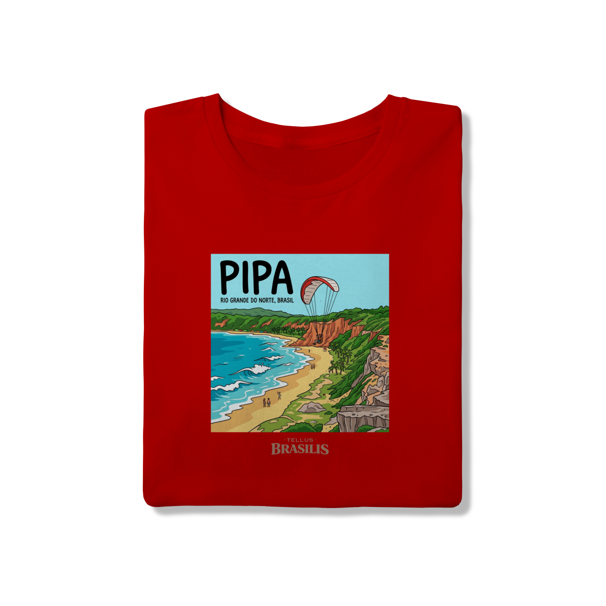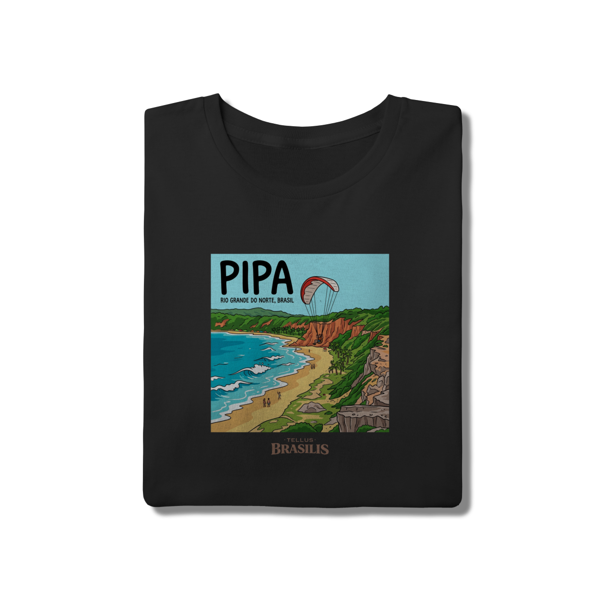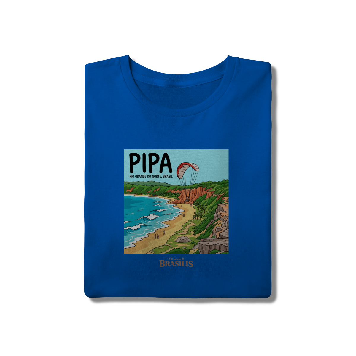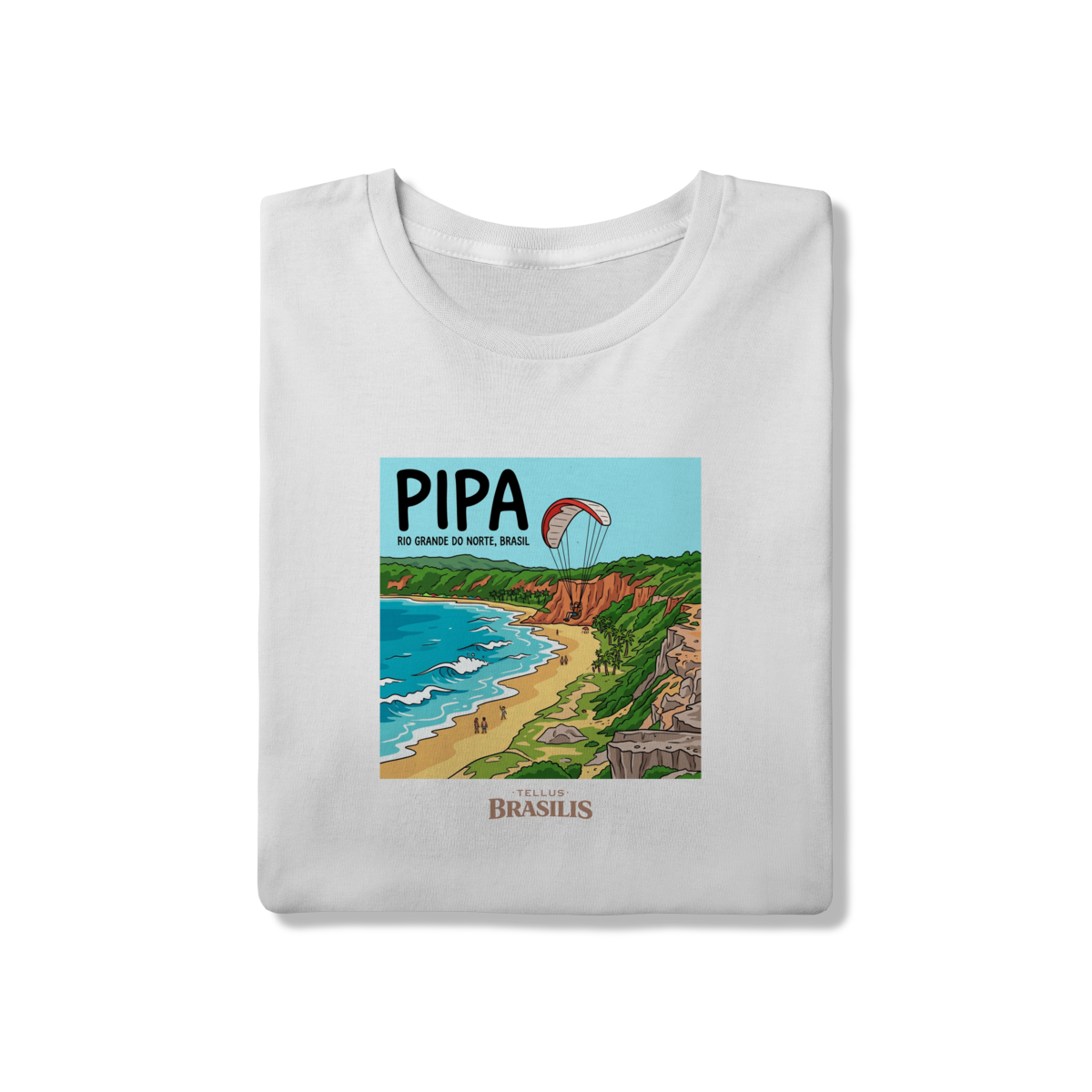 A estampa celebra a energia vibrante da Praia de Pipa, no Rio Grande do Norte, retratada com seus falésias coloridas, mar em tons de azul intenso e a atmosfera de aventura que marca o destino. O destaque para o parapente sobre as falésias traduz o espírito livre de Pipa, onde natureza, esporte e paisagem se encontram em perfeita harmonia.