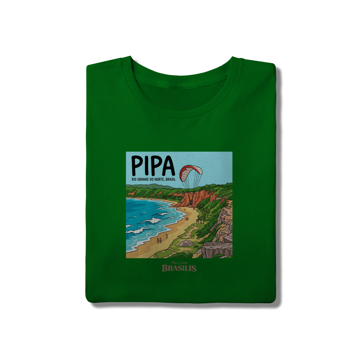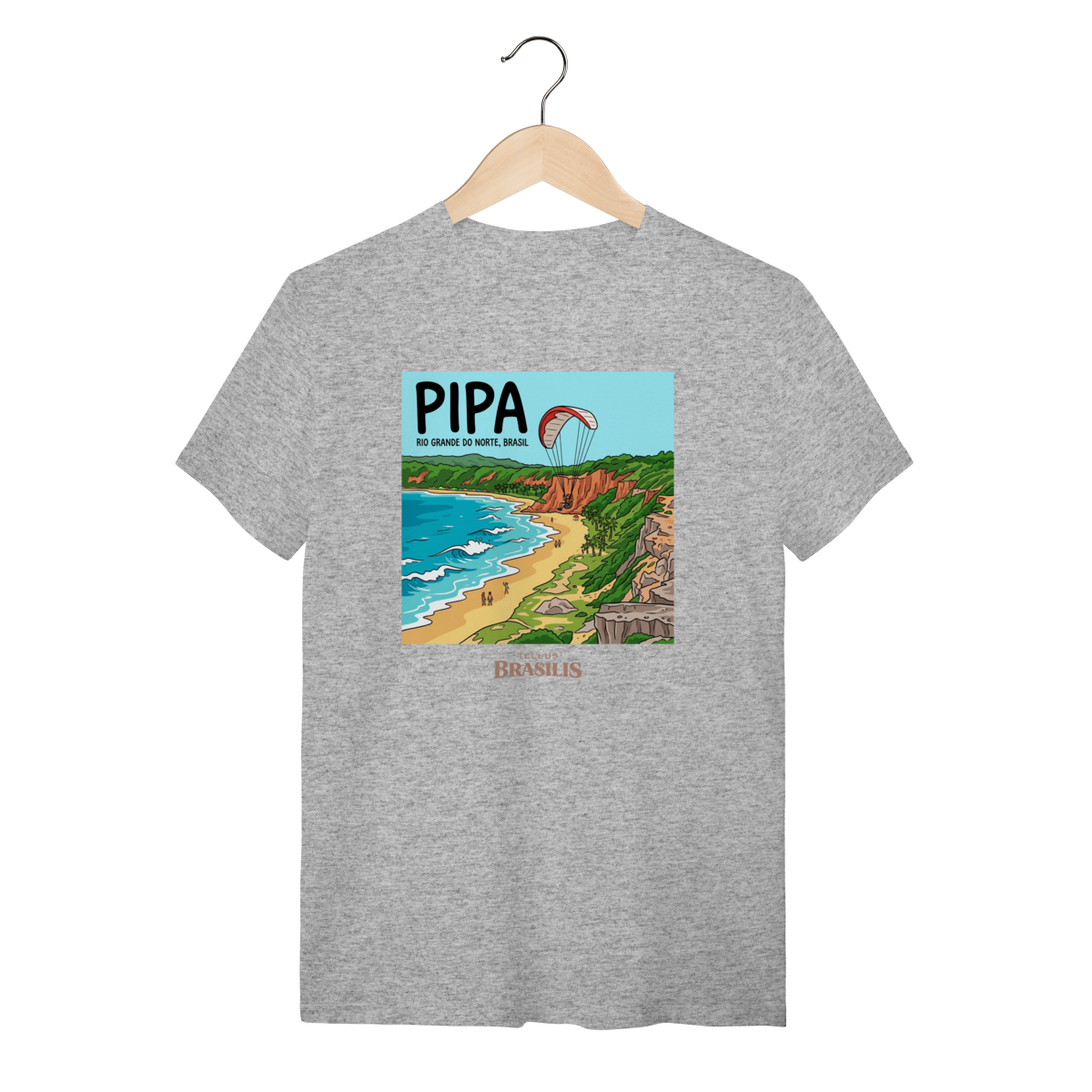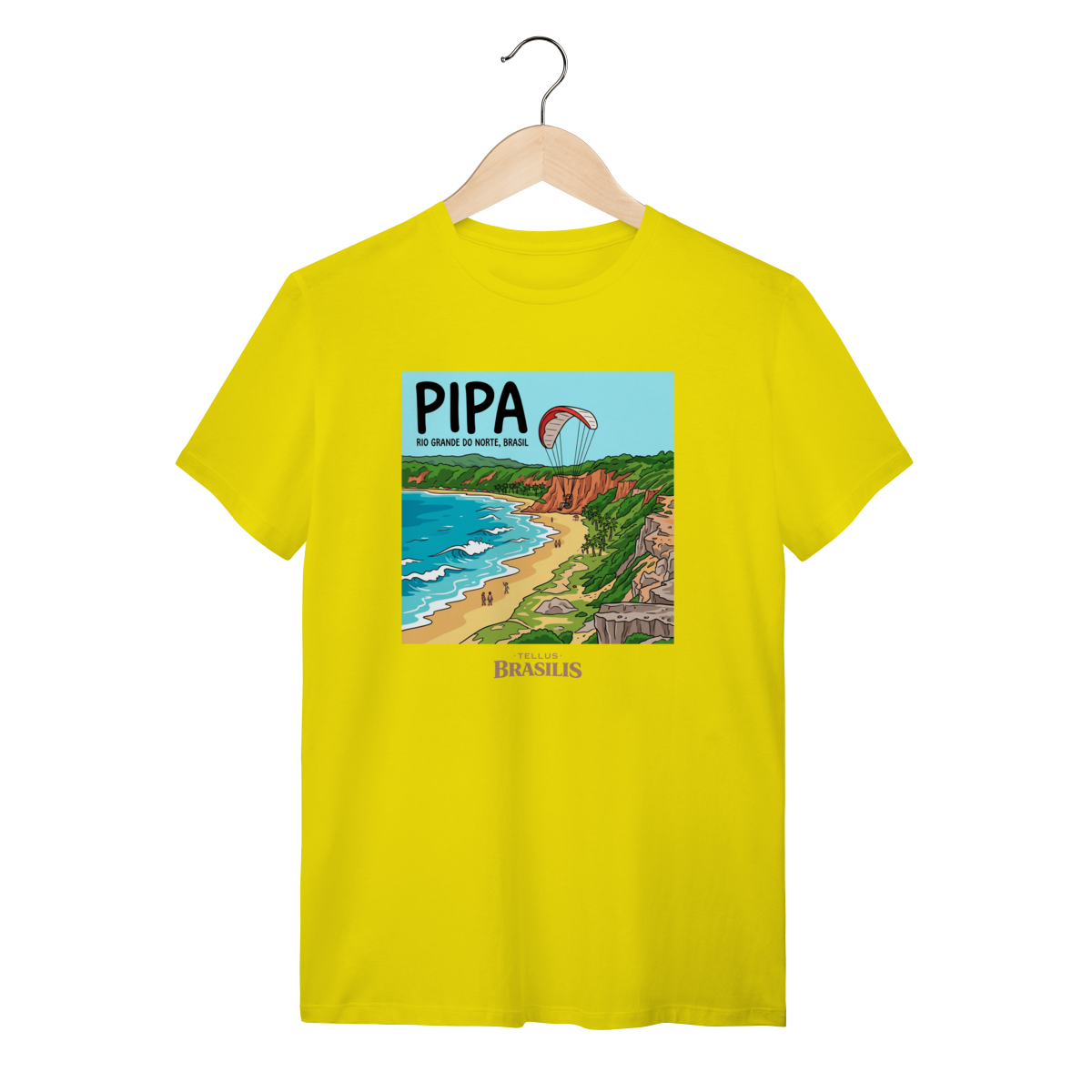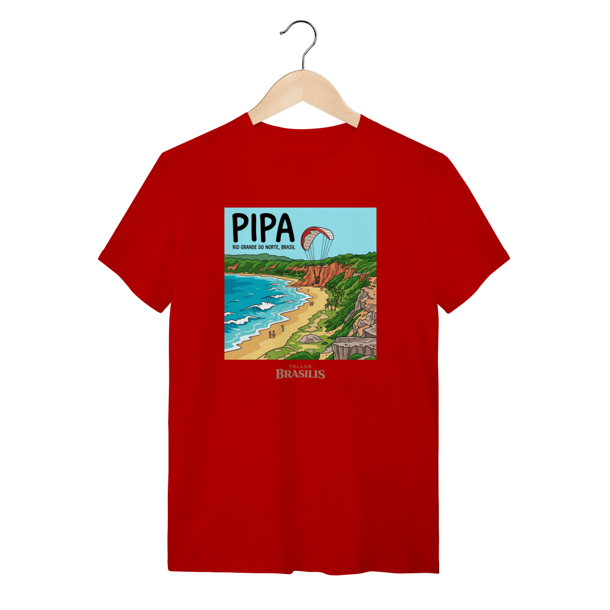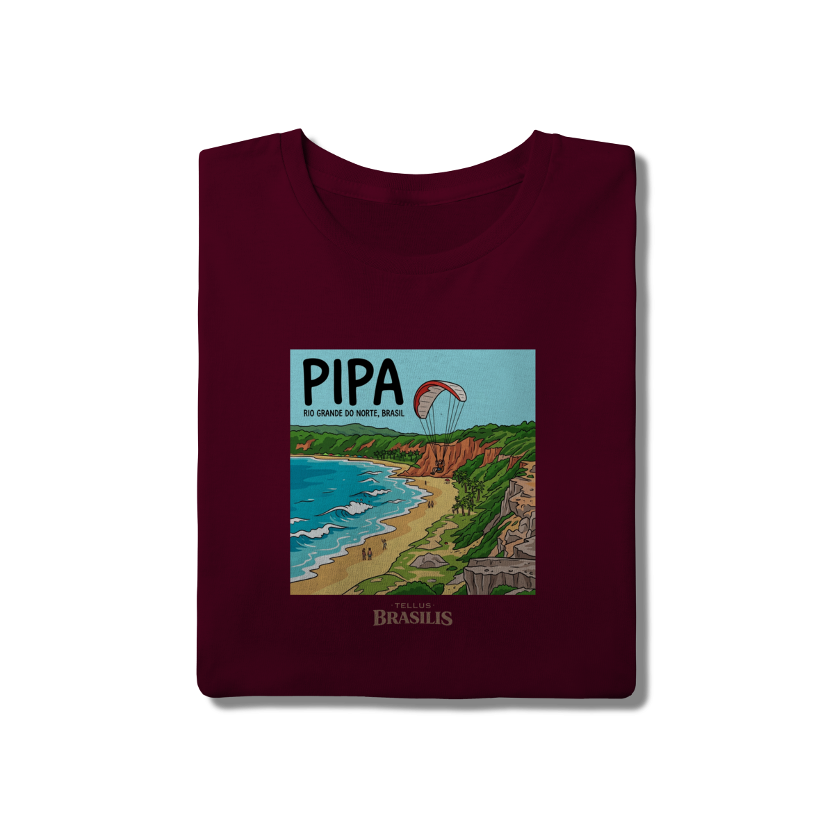 A estampa celebra a energia vibrante da Praia de Pipa, no Rio Grande do Norte, retratada com seus falésias coloridas, mar em tons de azul intenso e a atmosfera de aventura que marca o destino. O destaque para o parapente sobre as falésias traduz o espírito livre de Pipa, onde natureza, esporte e paisagem se encontram em perfeita harmonia.