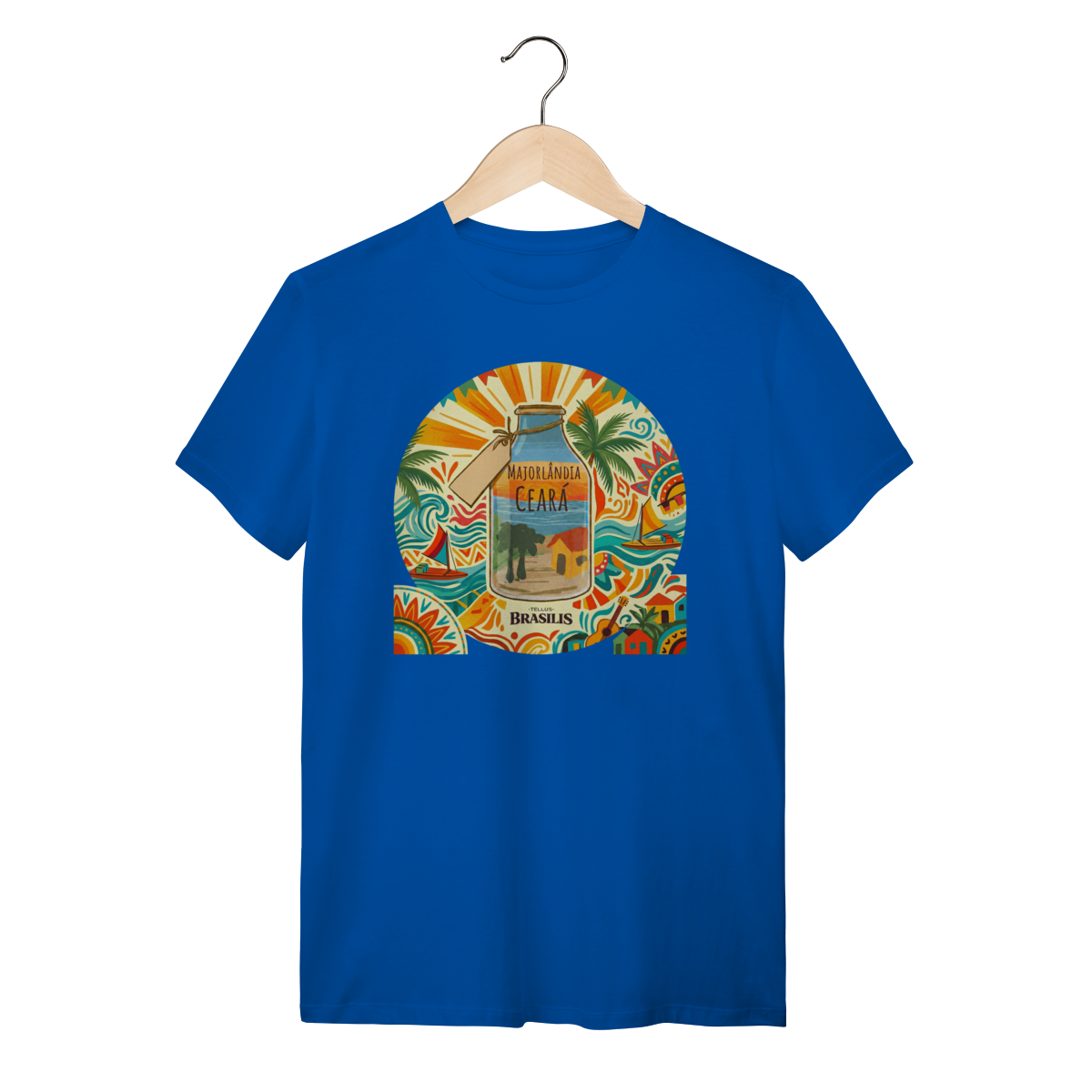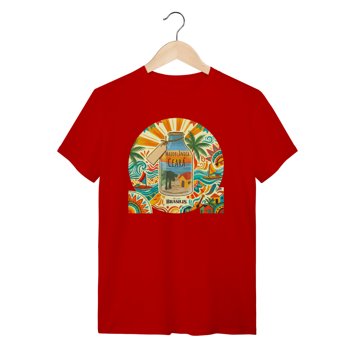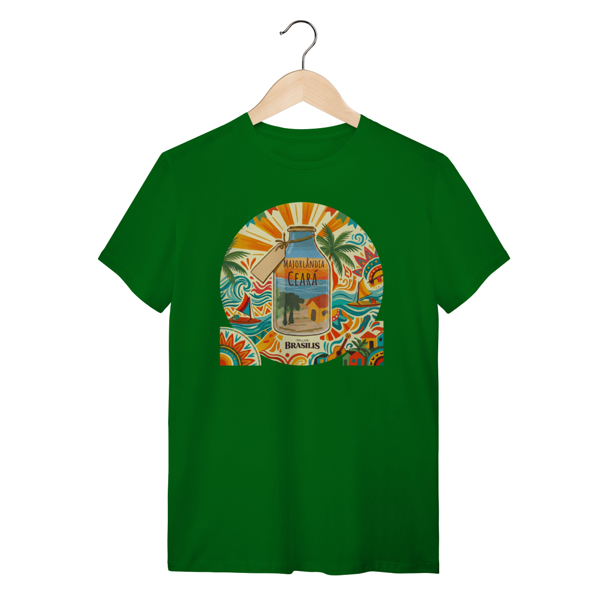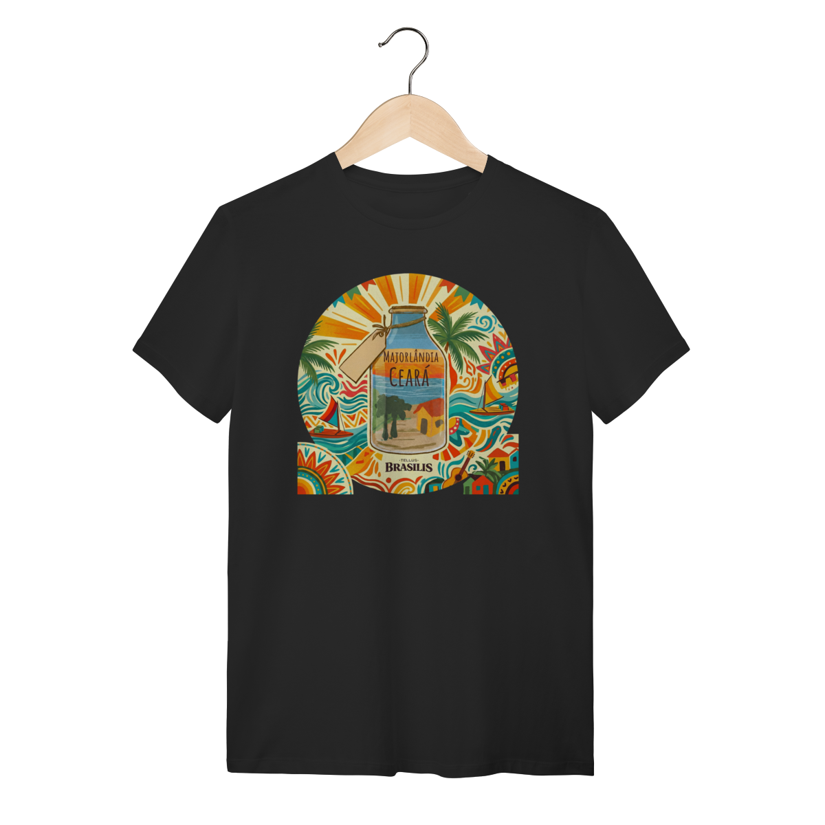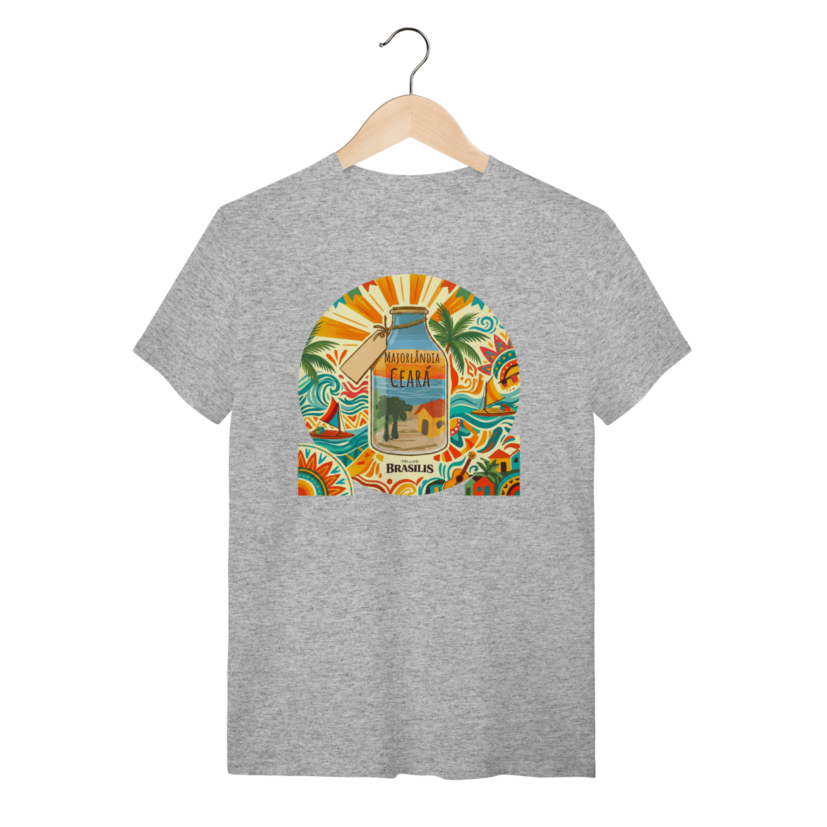 Esta estampa celebra a Praia de Majorlândia, em Aracati, com uma composição artística vibrante e cheia de significado. No centro, a icônica garrafinha de areia simboliza a tradição que nasceu em Majorlândia nas décadas de 1950–1960, quando artesãos locais passaram a transformar as areias coloridas da região em delicadas paisagens engarrafadas — um costume que se tornou referência cultural do Ceará e do Brasil.