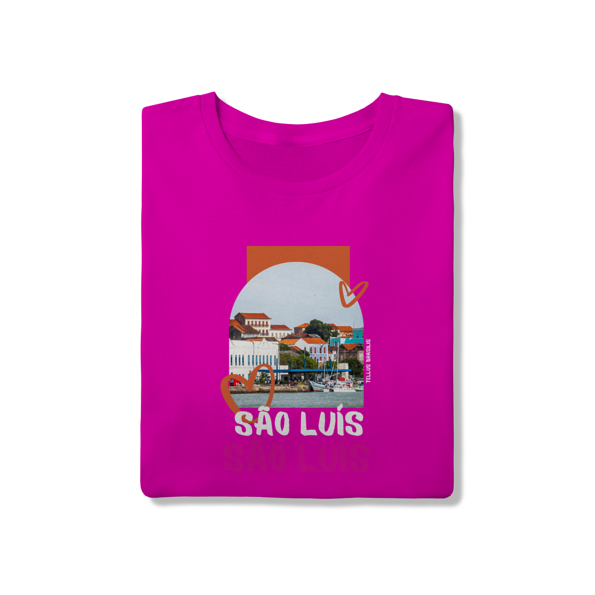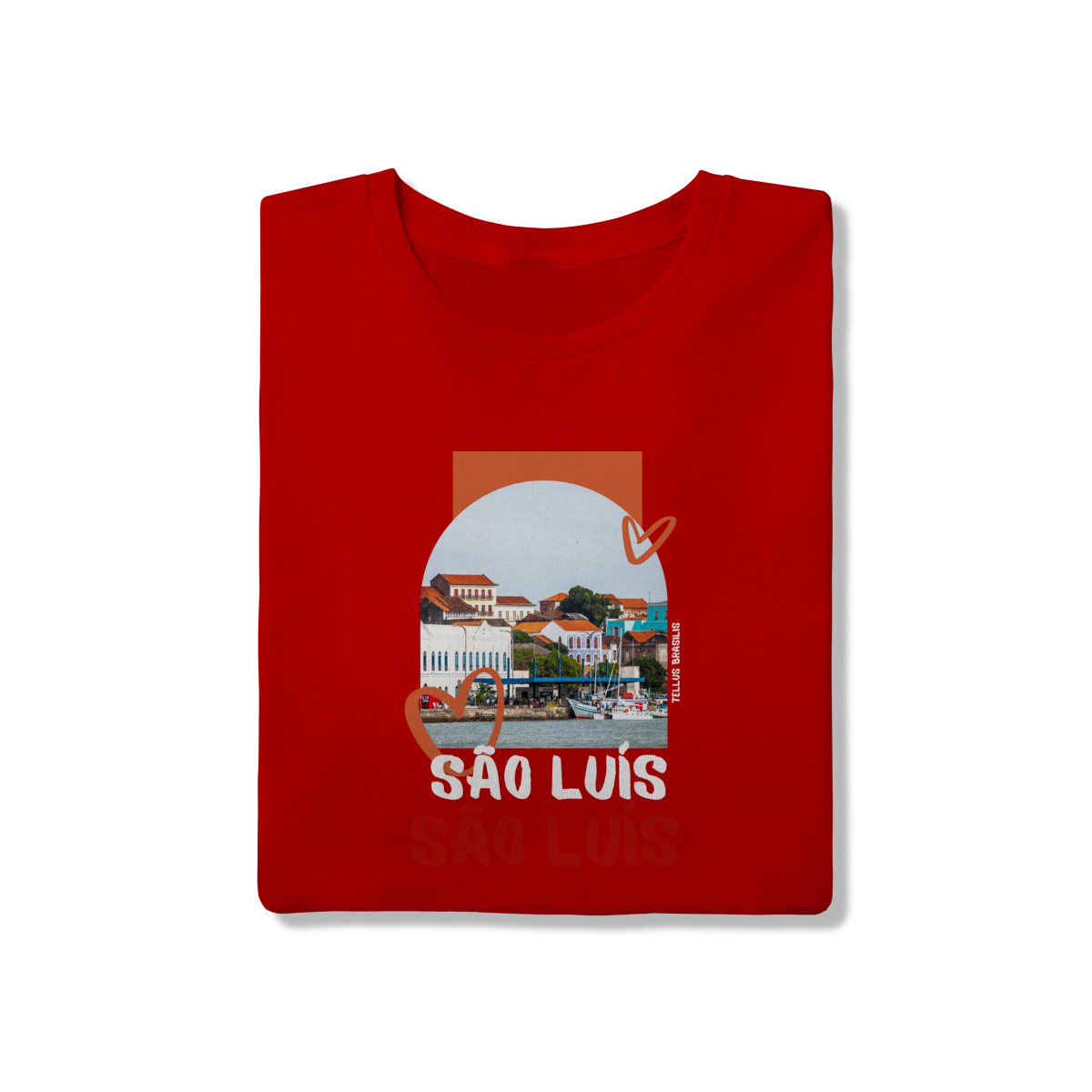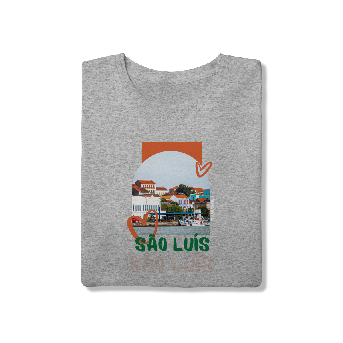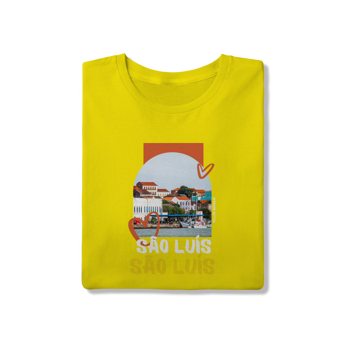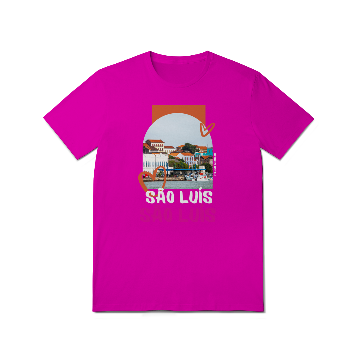Os elementos gráficos em forma de coração reforçam o afeto e o orgulho por São Luís, enquanto a tipografia expressiva do nome da cidade transmite identidade e pertencimento. A paleta de cores quentes remete ao clima, à cultura vibrante e à musicalidade que fazem parte da alma maranhense.