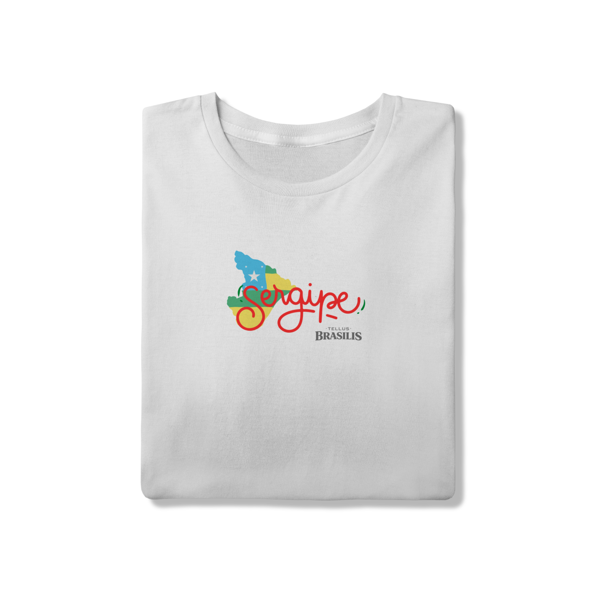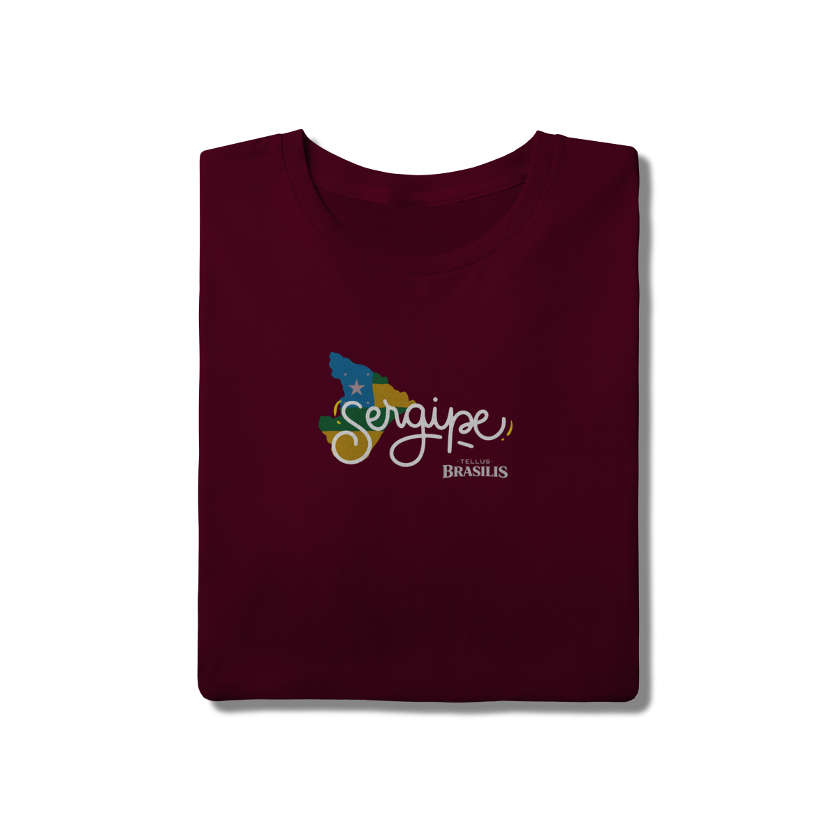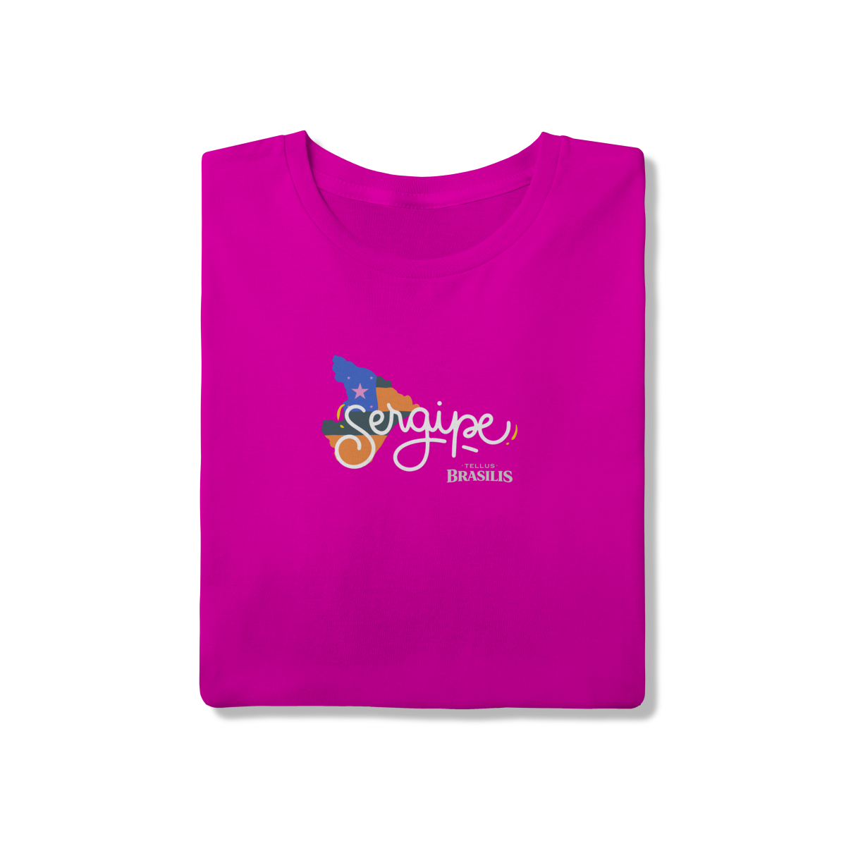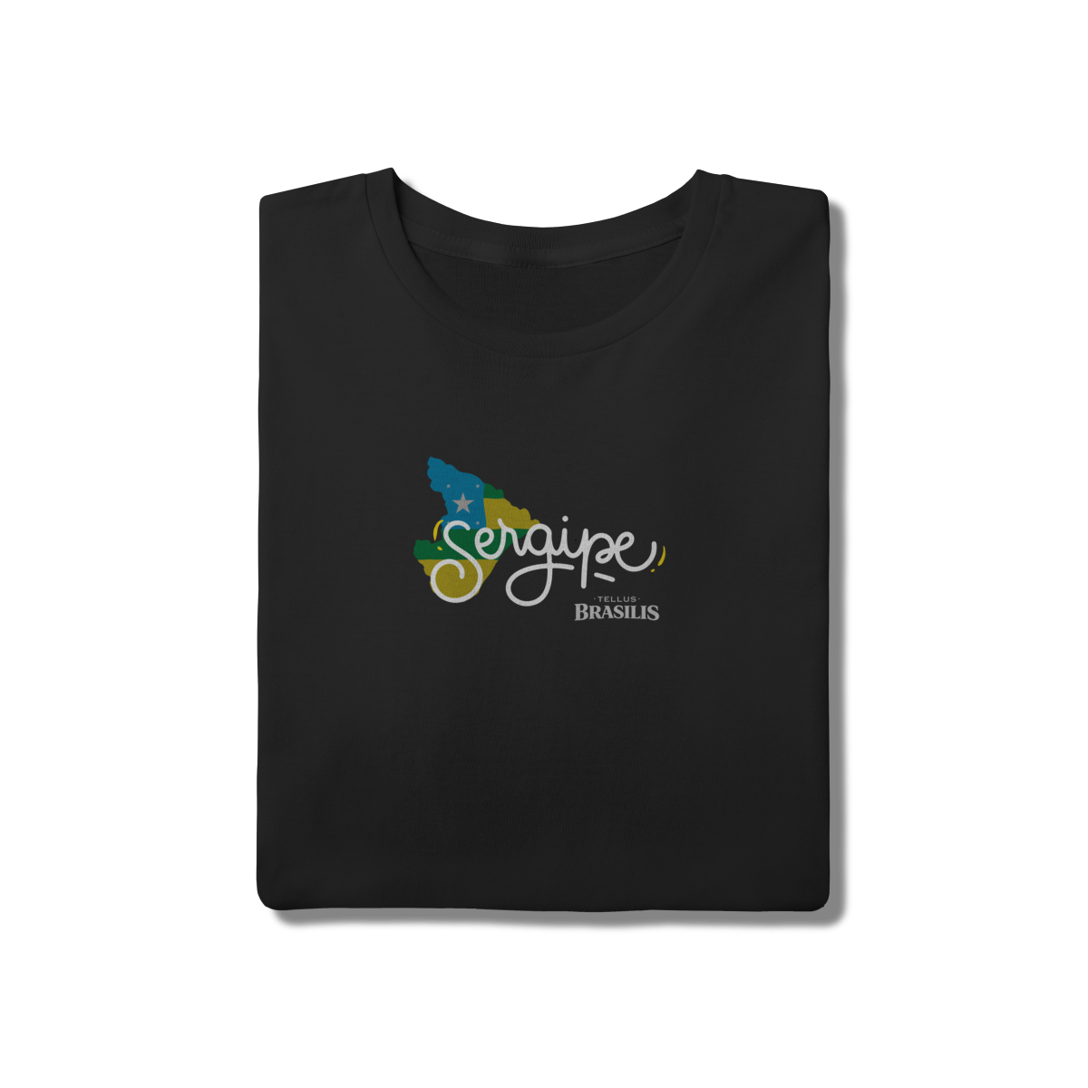 Nesta estampa, o nome Sergipe ganha destaque em uma tipografia expressiva e envolvente, sobreposto ao mapa do estado, que aparece ao fundo preenchido com as cores da bandeira de Sergipe. A composição cria um efeito visual marcante, onde palavra e território se unem para representar identidade, orgulho e pertencimento. O fundo escuro valoriza ainda mais as cores e faz o conjunto saltar aos olhos, com um visual moderno e cheio de significado.